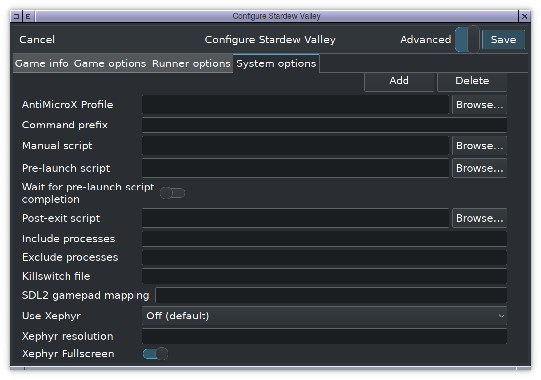 Open Lutris and click with the right mouse button on your game, selecting "Configure" to show the screen bellow: